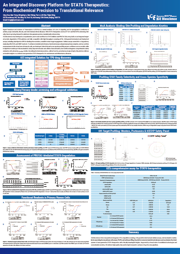 ICE Biosciences has developed a comprehensive, end‑to‑end workflow for STAT6 inhibitor and PROTAC discovery, built on our integrated target- ed protein degradation (TPD) platform and fully compatible with high‑throughput screening (HTS). Orthogonal biochemical and biophysical assays, including dual‑injection SPR for binding‑site resolution, establish robust target engagement. Cellular assays extend this to degradation, employing WB, FACS, and HiBiT readouts. To enhance translational relevance, functional assays using human primary samples, such as cytokine measurements in blood and smooth muscle cells, are developed. Selectivity and cross‑species profiling ensure confidence across models, while in‑depth MoA studies provide mechanistic clarity. Beyond molecular and cellular characterization, the workflow integrates comprehensive safety evaluation with advancing in studies. By uniting biochemical precision, cellular function, and pharmacological depth, this platform delivers actionable insights to accelerate next‑generation STAT6 therapeutics for autoimmune and inflammatory diseases.